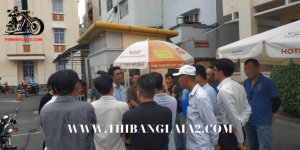 Học viên vào hội đồng thi để xin tờ khai biên bản sát hạch tổng hợp sát hạch GPLX mô tô và hoàn tất thông tin.